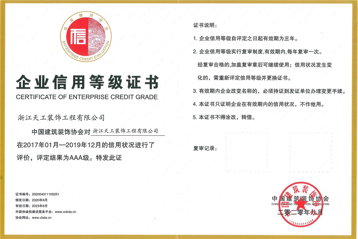 浙江天工裝飾工程有限公司成立于1994年,是一家專注于建筑行業(yè)近三十年,余杭區(qū)內(nèi)規(guī)模最大、最專業(yè)的現(xiàn)代化專業(yè)承包企業(yè),連續(xù)十二年榮獲“余杭區(qū)建筑業(yè)十強企業(yè)”稱號。公司現(xiàn)任余杭區(qū)建筑裝飾行業(yè)協(xié)會會長單位、杭州市建筑裝飾行業(yè)協(xié)會副會長單位、浙江省建筑裝飾行業(yè)協(xié)會副會長單位、中國建筑裝飾協(xié)會理事單位。公司具備建筑裝修裝飾工程專業(yè)承包壹級、建筑幕墻工程專業(yè)承包壹級、建筑裝飾工程設計專項甲級、建筑幕墻工程設計專項甲級、展覽陳列工程設計施工一體化貳級、電子與智能化工程專業(yè)承包貳級、消防設施工程專業(yè)承包貳級、防水防腐保溫工程專業(yè)承包貳級,集建筑工程施工總承包、建筑機電安裝、城市及道路照明、鋼結(jié)構、結(jié)構補強、安防施工等多項資質(zhì)。主要從事大型公共建筑、星級酒店的室內(nèi)精裝修、建筑幕墻及建筑智能化工程的設計與施工。 天工裝飾始終把建筑裝飾當作一項 “美的事業(yè)”,在施工中嚴把質(zhì)量關,不斷規(guī)范和提升工程技術標準。近年來,公司承建的浙商開元名都國際酒店I標段裝飾工程、杭州藝尚雷迪森廣場酒店裝修工程、余杭區(qū)時代廣場5號樓(市民之家)室內(nèi)裝飾工程、永安之星室內(nèi)裝飾工程、青山湖科技城創(chuàng)業(yè)廣場裝修工程、杭州未來科技城醫(yī)院室內(nèi)裝飾工程、杭州師范大學附屬實驗學校裝修工程、杭州老板電器股份有限公司辦公樓裝飾工程、深川控股集團綜合樓幕墻工程、浙江省科技信息研究院幕墻工程、北航杭州創(chuàng)新研究院(余杭)內(nèi)裝及智能化提升改造項目(研究生院)工程、臨平新城人才服務中心設計釆購施工(EPC)工程總承包項目、浙江大學先進電氣裝備創(chuàng)新中心室內(nèi)外裝飾及改造項目設計采購施工(EPC)工程總承包項目等,先后獲得“中國建筑工程裝飾獎”、“全國建筑裝飾科技創(chuàng)新獎”、浙江省建設工程“錢江杯”優(yōu)質(zhì)工程獎、杭州市建設工程“西湖杯”優(yōu)質(zhì)工程獎、嘉興市建設工程“南湖杯”優(yōu)質(zhì)工程獎、“浙江省優(yōu)秀建筑裝飾工程獎”、“浙江省優(yōu)質(zhì)安裝質(zhì)量獎”等榮譽。 天工裝飾恪守“誠實守信、文明經(jīng)營”,近年來公司得到了客戶的信賴也獲得了業(yè)界的好評,先后被評為“國家級守合同重信用單位”、“全國建筑裝飾行業(yè)AAA級信用企業(yè)”、“全國百家科技創(chuàng)新型企業(yè)”、“浙江省AAA級守合同重信用單位”、“人民銀行信用等級AAA級企業(yè)”、“浙江省信用管理示范企業(yè)”、“浙江省誠信企業(yè)”、“浙江省建筑裝飾行業(yè)強優(yōu)企業(yè)”、“杭州市建筑業(yè)優(yōu)秀企業(yè)”、“余杭區(qū)建筑業(yè)十強企業(yè)”、 “余杭區(qū)人民政府質(zhì)量獎”等榮譽。